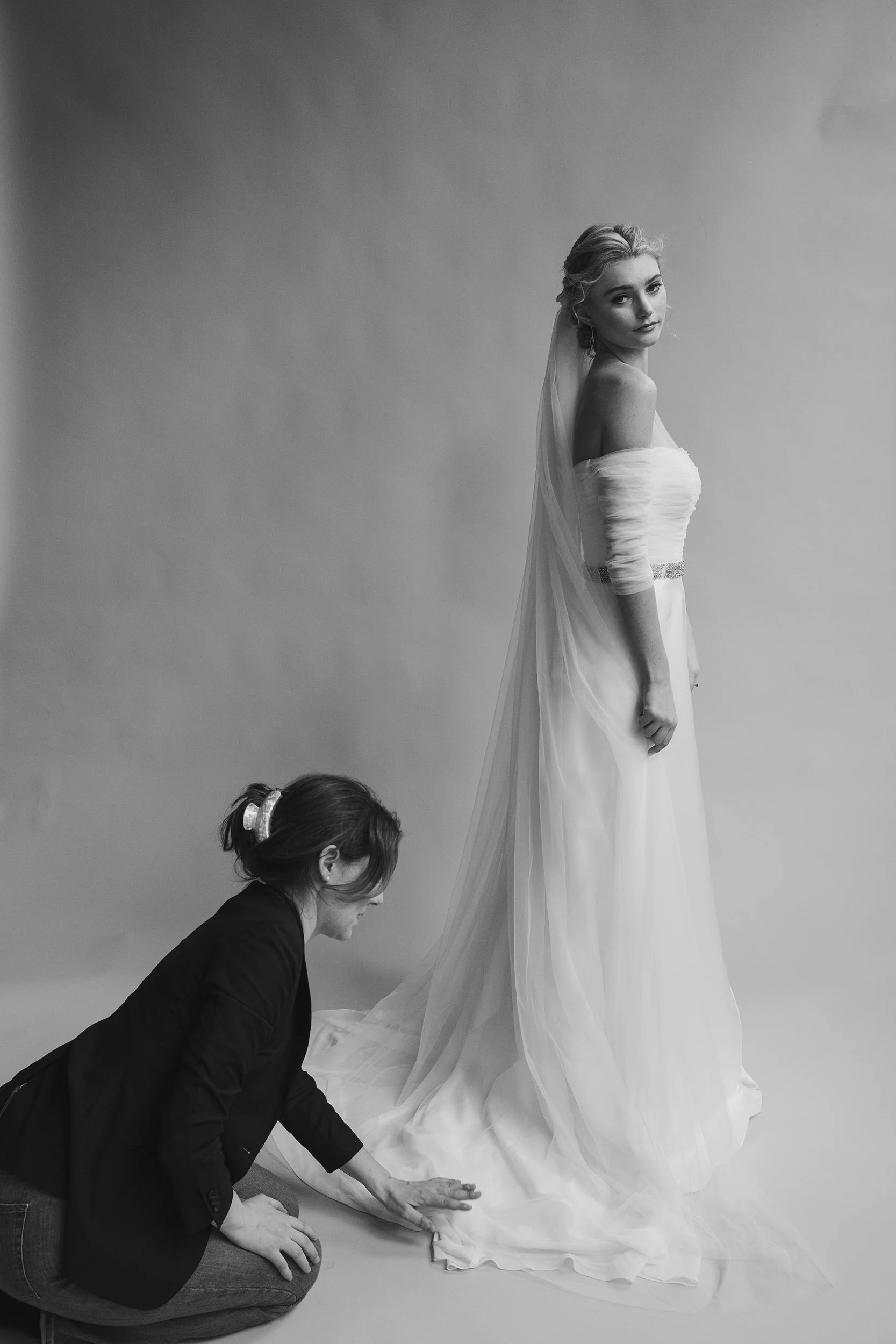 Begin your custom couture experience with a private design consultation in our Philadelphia studio. During this appointment, you will collaborate directly with designer Victoria to define the vision for your custom wedding dress or bespoke suit. Together, you will select fabrics, silhouette, construction details, and finishing elements. Precise body measurements are taken to draft a custom pattern, and your garment development begins with the creation of a tailored prototype.